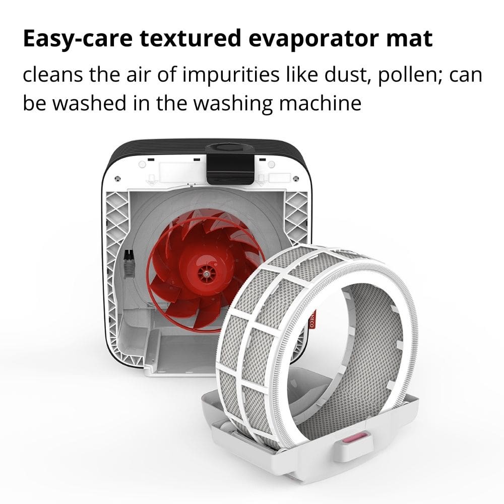 - [Air Washer + Evaporator Mats]: Uses water to trap impurities and add natural humidity.